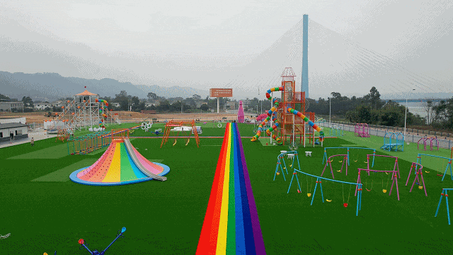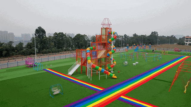 (二)是安全生态设计:所有设施采用环保木材与防锈涂层,保留场地原生树木,结合坡地地形打造"零电力"自然游乐场景。